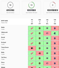 In our NHL Pick 'em pool format your members will pick the winner of all (or a subset) of the Saturday games. Running this format on your own can be very time consuming to keep up with gathering the picks and calculating standings manually. That is where we come in.